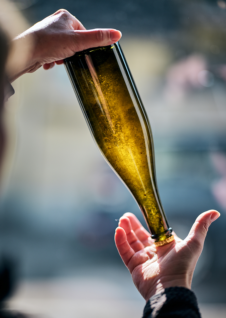 Nach der Reifung wird die Hefe durch Rütteln der Flaschen langsam in den Flaschenhals befördert. Dort sammelt sie sich und wird beim Degorgieren entfernt.